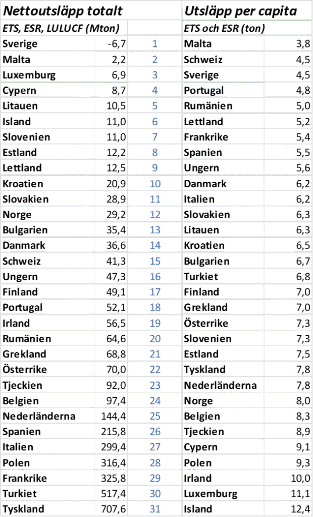 Den första kolumnen i tabellen nedan visar nettoutsläppen när man räknar ihop ETS, ESR samt LULUCF. För de flesta länder är LULUCF en sänka, alltså något som drar ner de total utsläppen – men inte från alla. Länder som till exempel har lite skog och mycket jordbruk släpper ofta ut mer växthusgaser från jordbruket än som totalt binds i skog och mark. I den andra kolumnen, så är det utsläppen nedbrutna till per/capita, men det här gången är endast ETS och ESR medtagna. Detta för att visa att Sverige står sig mycket väl även om vi inte räknar in den stora sänkan som vi kan tillgodoräkna oss i LULUCF.